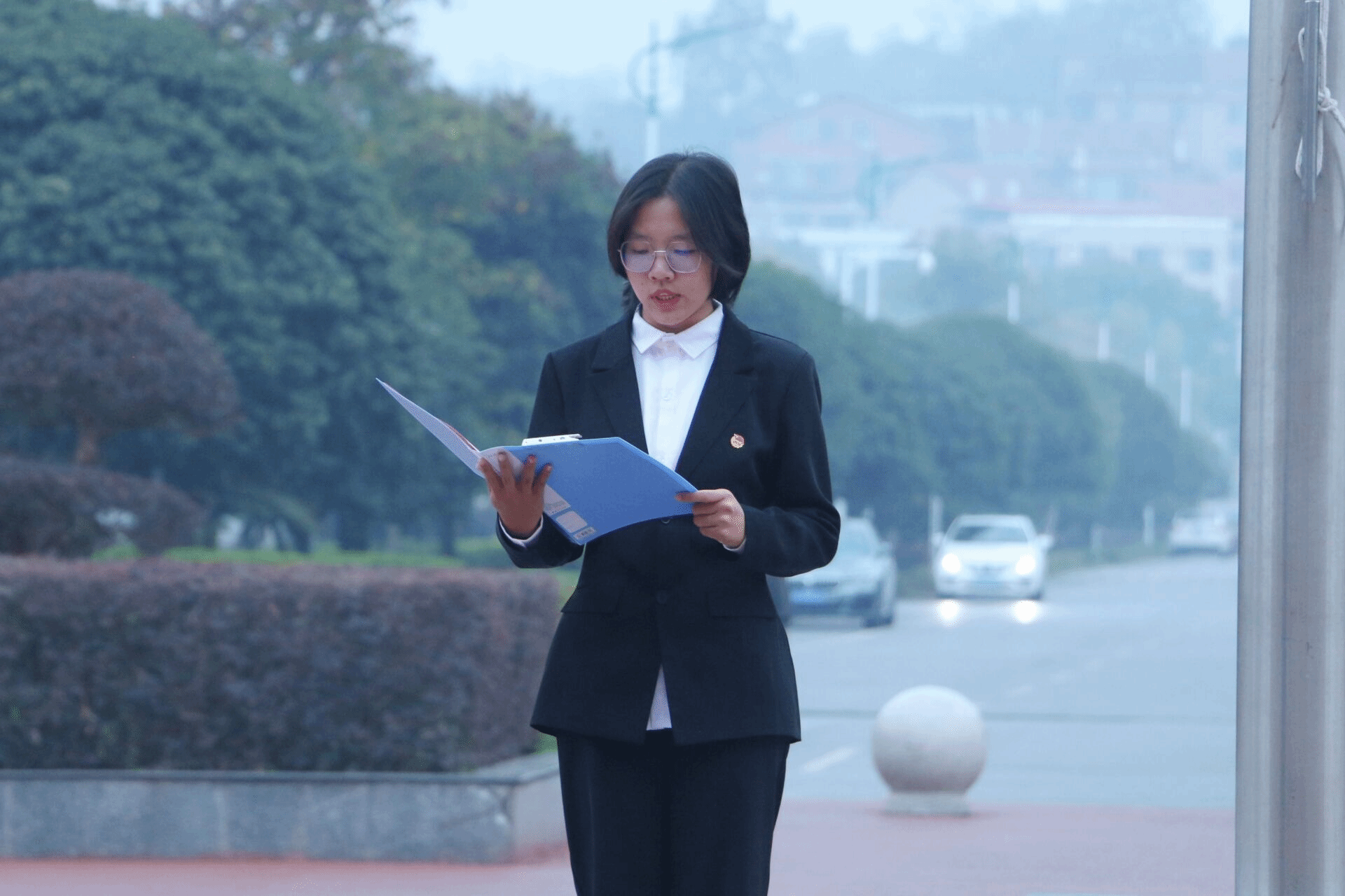 在五星红旗的照耀下,24级新闻学一班的杨思雨同学作为代表在红旗下讲话,以分享“中国青年故事”为主题,诠释了作为中国新青年该具有的担当与责任。