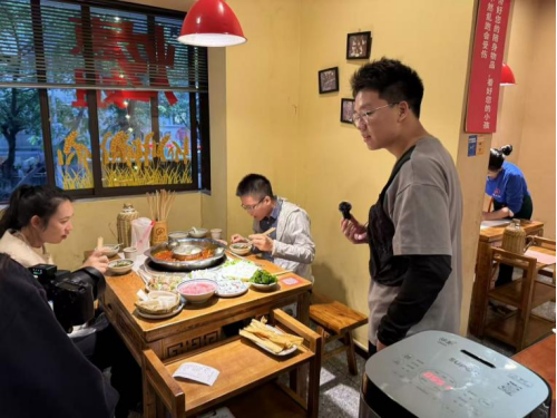 美食让我们无比热爱一座城市,不同的美食也记录着不同的重庆。上午十点,夏老太蹄花店就迎来了第一批“客人”。店内灯光柔和,一股浓郁的香气扑鼻而来,那是重庆蹄花特有的鲜美与醇厚。店主向廖周伟、刘畅小组介绍了蹄花的制作过程,“最关键的是那锅老汤,几十年的传承,里面加了十几种中草药和调料,味道醇厚而不腻”。