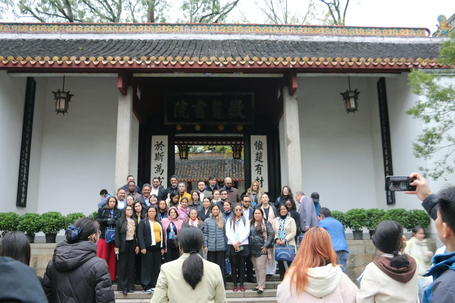岳麓书院前,一群外国友人正兴致勃勃地参观。他们被这座千年学府的魅力所吸引,在门口合影留念。岳麓书院作为中国古代文化的重要象征,其深厚的底蕴和独特的建筑风格,正吸引着越来越多的国际游客前来探寻中国传统文化的奥秘。