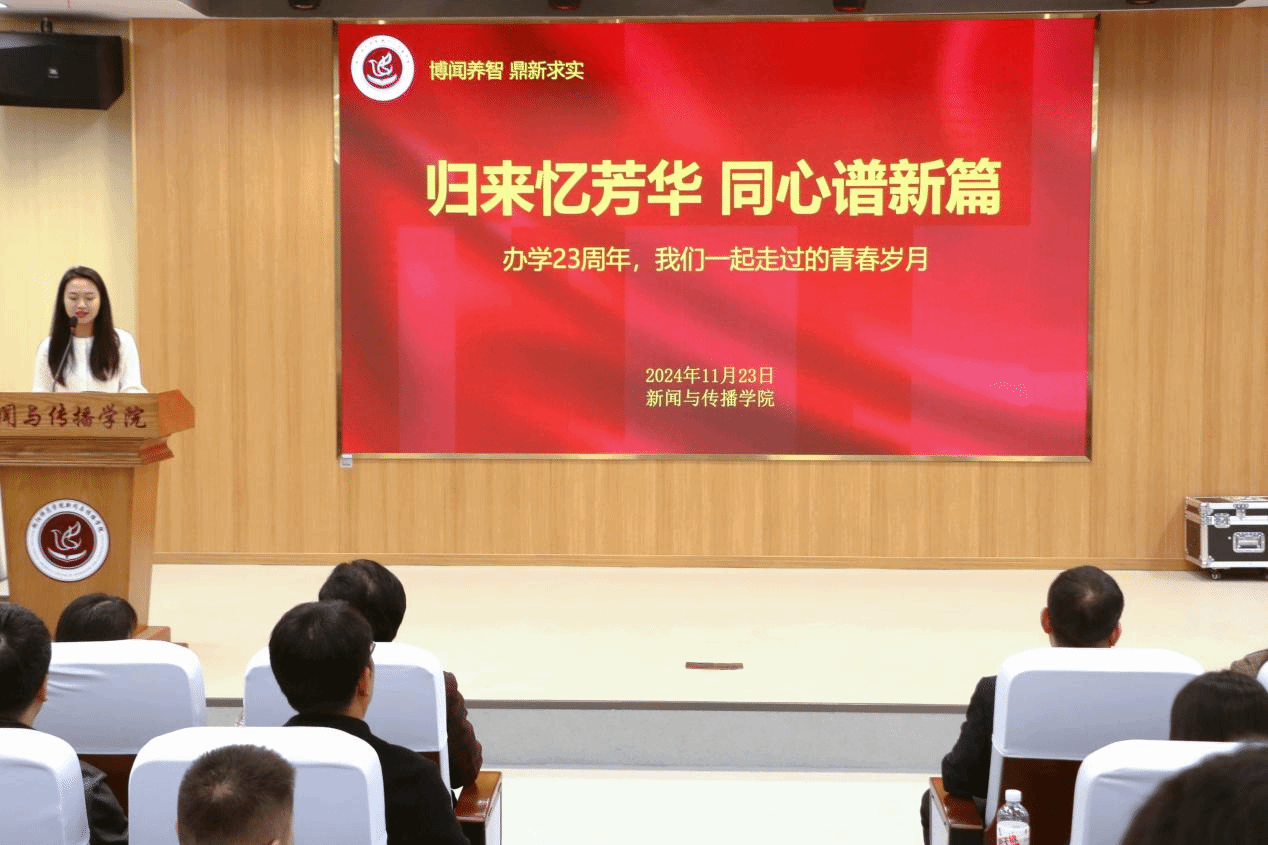 活动伊始,彭晖书记首先登台致欢迎词,他说道:“我们都是一家人,这次活动大家都放松一点。”一番话落,现场氛围瞬间轻松融洽起来。他提到,23岁,风华正茂,我们在两个百年间的进程中乘风破浪、砥砺前行。员工们也是不忘来时路,尽他们最大的努力为母校献一份力,为新传增添光彩。彭晖书记真挚地表示,无论新传的员工们身在何方,从事何种职业,母校永远与你们同在。