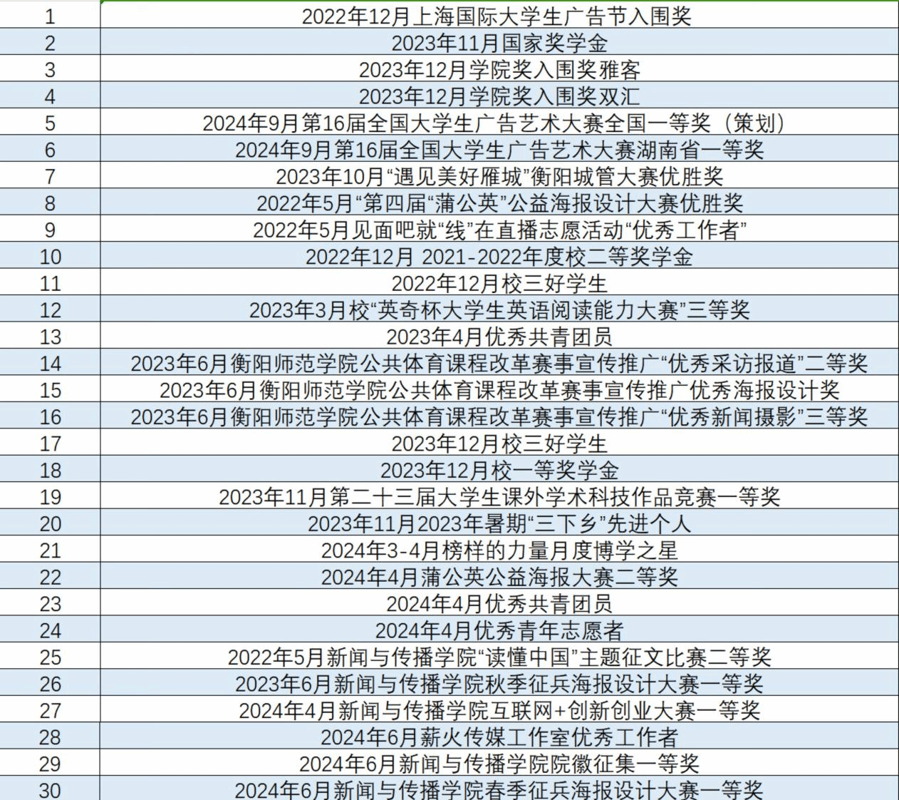 他在传媒领域表现卓越,于2024年湖南卫视&芒果tv青芒计划人才选拔中,以面试第一的成绩成为芒果导演预备役,团队及个人均获第三名,且作为青芒代表登上《你好星期六》与时代少年团同台。在竞赛方面成绩斐然,斩获第十六届大广赛全国三等奖、老员工挑战杯国家二等奖及省一等奖、第15届大广赛省二等奖、湖南省高校优秀广播电视节目省三等奖等众多荣誉。他还被衡阳团市委聘为“美食星推官”与青年品牌推介官,个人海报在全市投放。连续两次主持湘南师范生就业直播并受省级媒体报道,蝉联tyc122ccvip两届主持人大赛冠军。在校担任艺术团舞蹈队队长,多次获评优秀队长与优秀志愿者,积极投身校园艺术活动,主持或参与校级院级活动近20 余项,在校园与传媒舞台上持续绽放光芒,展现出新时代青年的无限活力与才华。