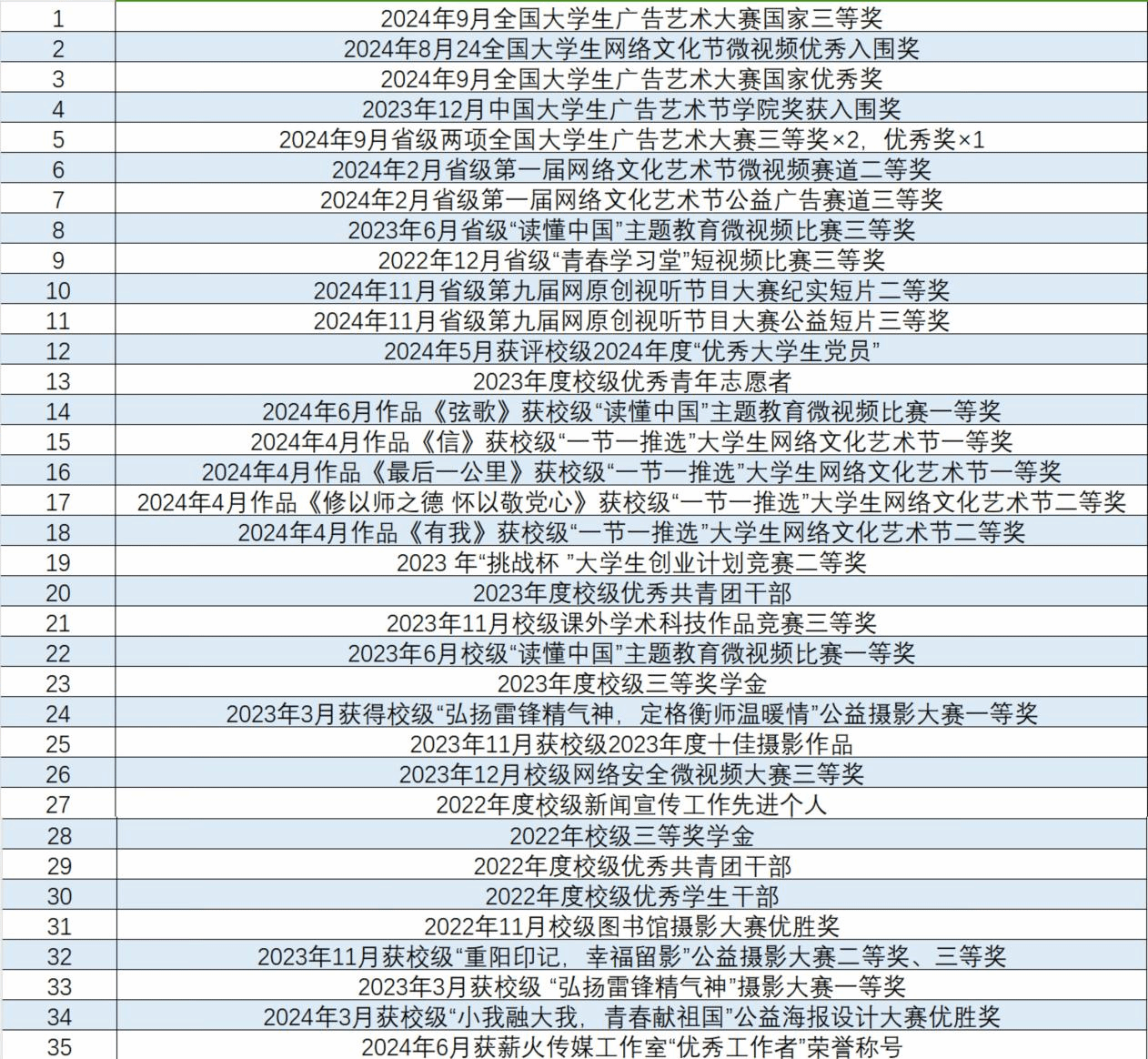 曾获校级“优秀老员工党员”、“优秀青年志愿者”、“优秀共青团干部”、老员工广告艺术大赛国家三等奖、全国老员工网络文化节微视频国家优秀入围奖等国家级荣誉4项、省级荣誉8项、校级荣誉25项。