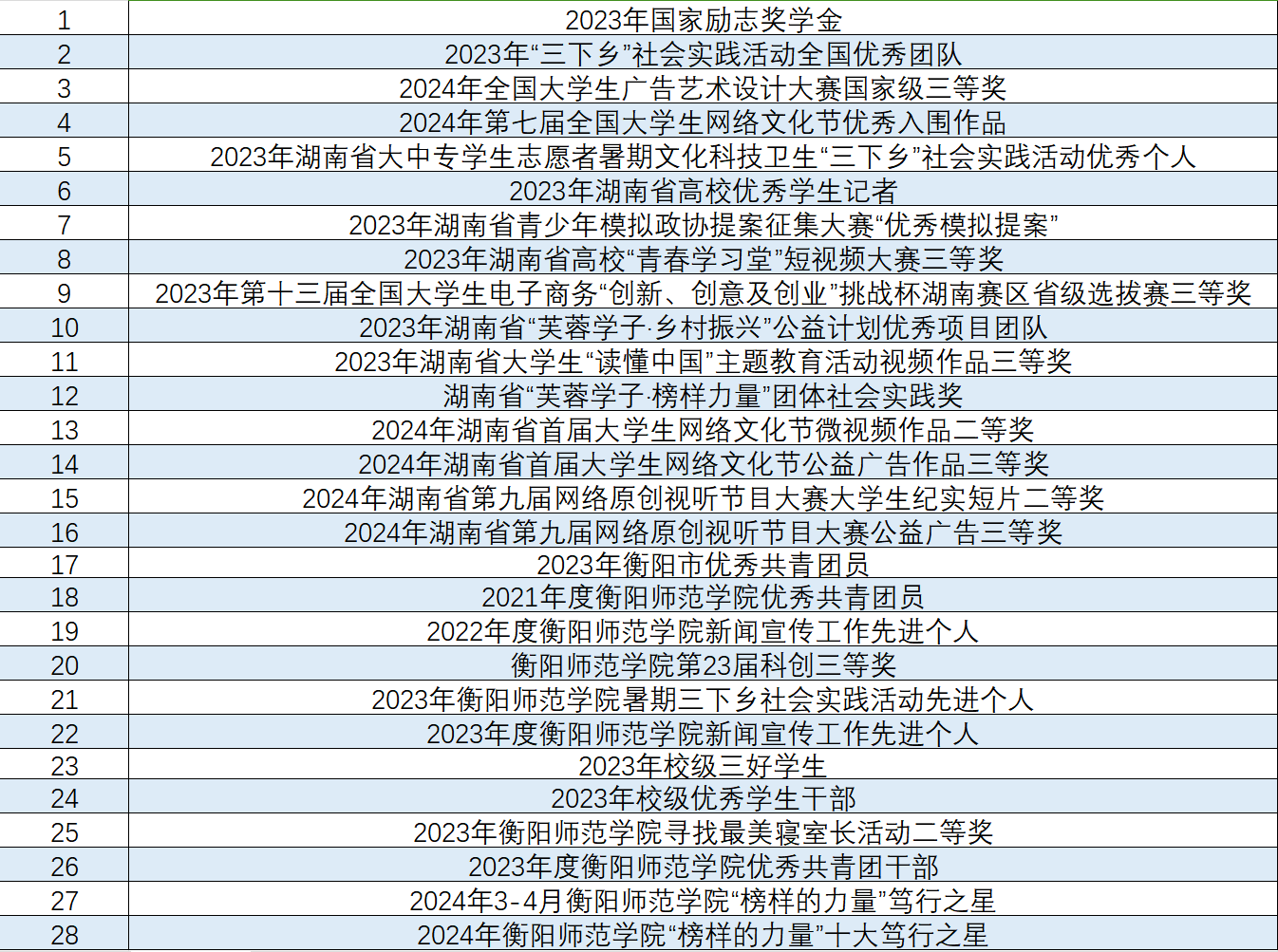在校期间,她夯实学业,砥砺前行,累计获得国家级、省级荣誉17项、院级及以上荣誉37项。连续三年综合测评位列全班前五,曾获国家励志奖学金,校二等奖学金;将理论落地实践,积极参与各项学科竞赛,曾获第七届全国老员工网络文化节国家级优秀入围作品、全国老员工广告艺术设计大赛国家三等奖、湖南省第九届网络原创视听节目大赛省级二等奖等。个人曾获评“湖南省高校优秀员工记者”、“湖南省三下乡优秀个人”“衡阳市优秀共青团员”、校级“新闻宣传先进个人”、校级“优秀员工干部”等荣誉称号。