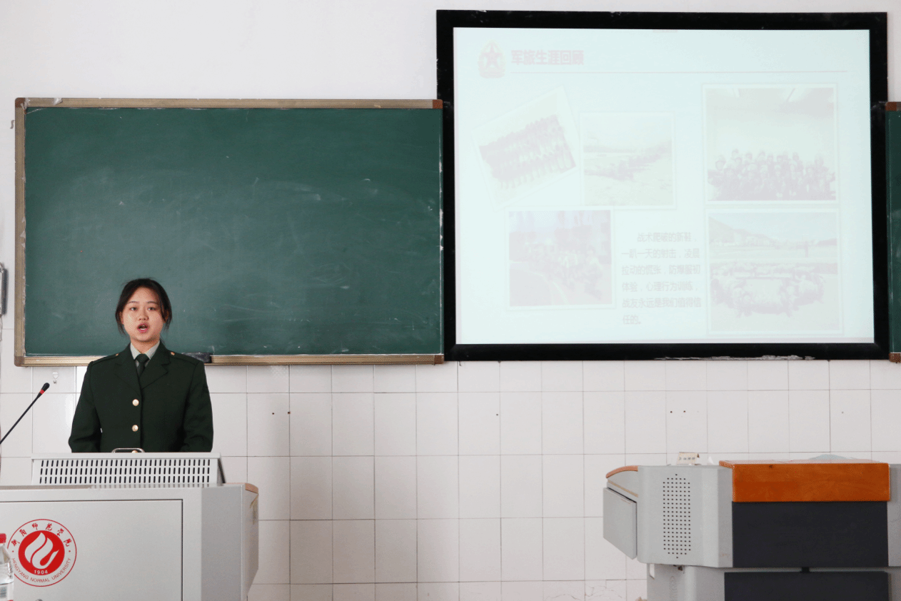 退伍士兵秦嘉裕同学在会上分享了她在军旅生涯中的成长与收获。同时她也鼓励大家投身军营,报效祖国,这让在场的同学们对部队生活有了更直观的了解。她自豪地说:“我一直觉得,不是我为祖国奉献了两年,而是祖国呵护了我两年。短短两年,我却收获了一辈子的宝贵财富。”