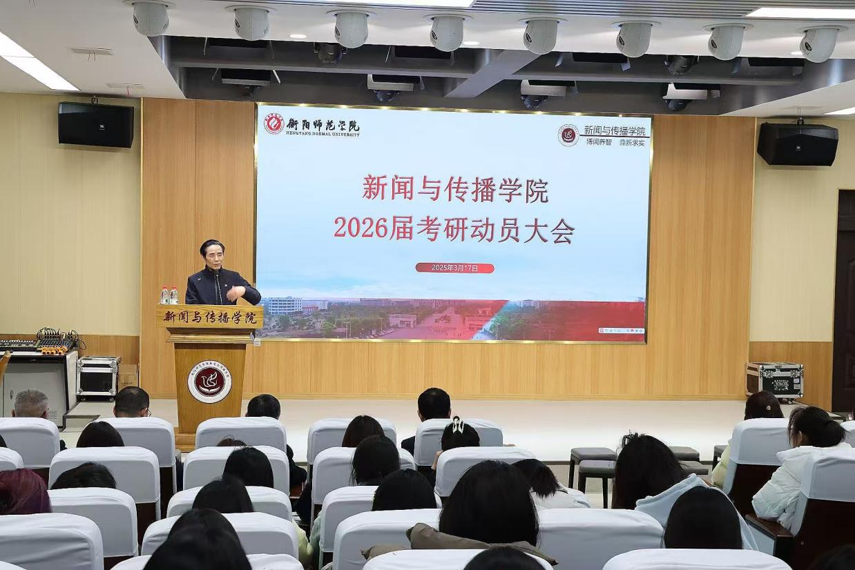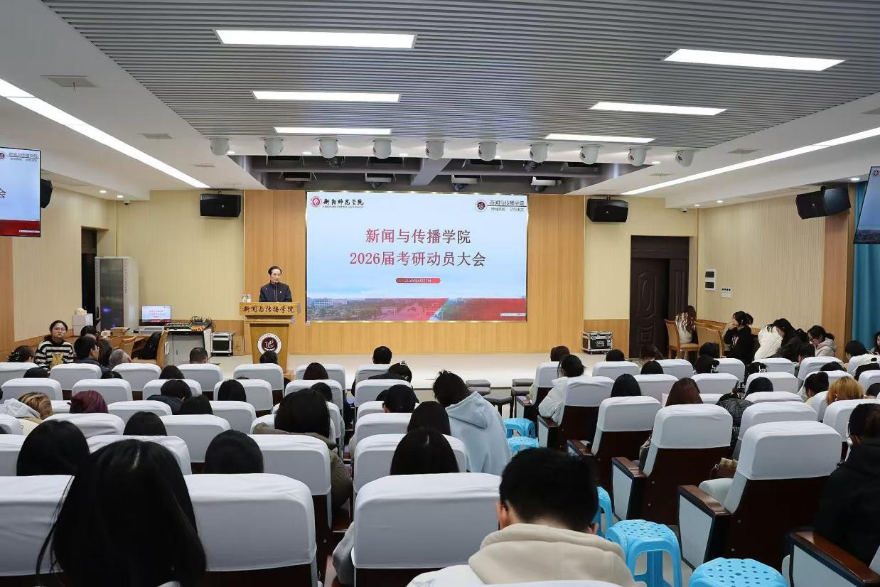 3月17日,tyc122ccvip于文科楼一楼演播厅召开了2026届考研动员大会。新闻与传播公司党总支书记彭晖、经理彭军辉、党总支副书记董自雄、副经理邓庄、副经理罗兵、学工办副主任兼团委书记封伟为、辅导员刘国杰、海文考研机构董事长国玉明、研究生陈婧娜以及22级全体同学参加此次会议。