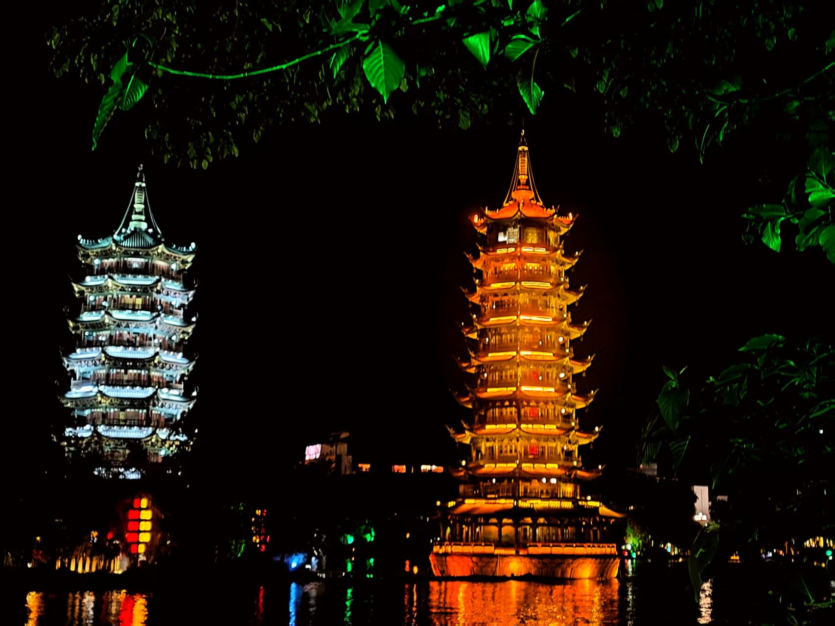 夜幕降临,日月双塔便成为了桂林最耀眼的存在。这两座塔坐落在桂林城的中轴线上,与“象山水月”相邻,日塔为黄铜建造,又称金塔,高41米,创下三项世界之最;月塔为琉璃塔,又称银塔,高35米,庄重典雅。