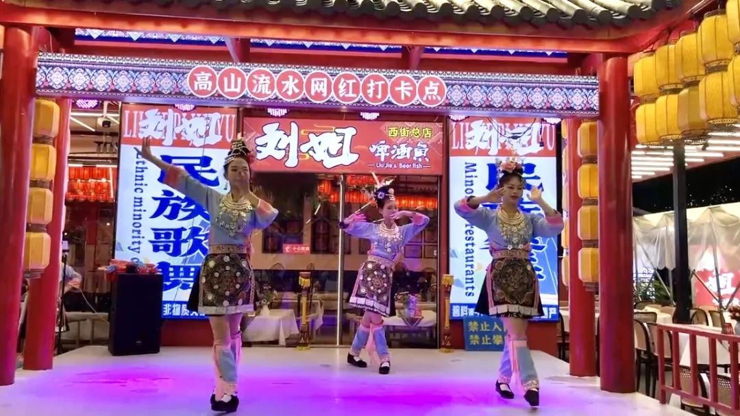 民族舞表演——舞蹈将漓江渔火糅进舞步,壮族织锦的纹样流转在翻飞的裙裾间,瑶族银饰随鼓点叮咚作响,恍若山泉叩击青石。歌声与舞步完美融合,展现出桂林少数民族文化的独特魅力。