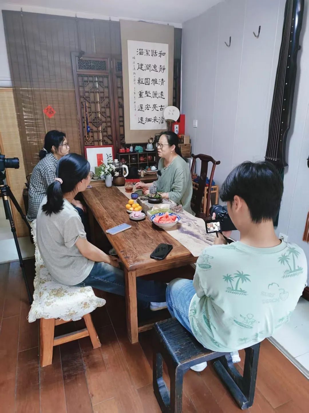 在采访过程中,刘艳老师向我们热情分享了自己学琴的经历与对于古琴文化传承的展望与期待,我们小组的成员在采访过程中也获益匪浅,对于古琴文化的认识又上升到了一个新的层次。这一次的采访大家都全情投入,各司其职,十分认真,把体会都纳入镜头内,用满满当当的照片与视频素材为今天书写了一份满意的答卷!