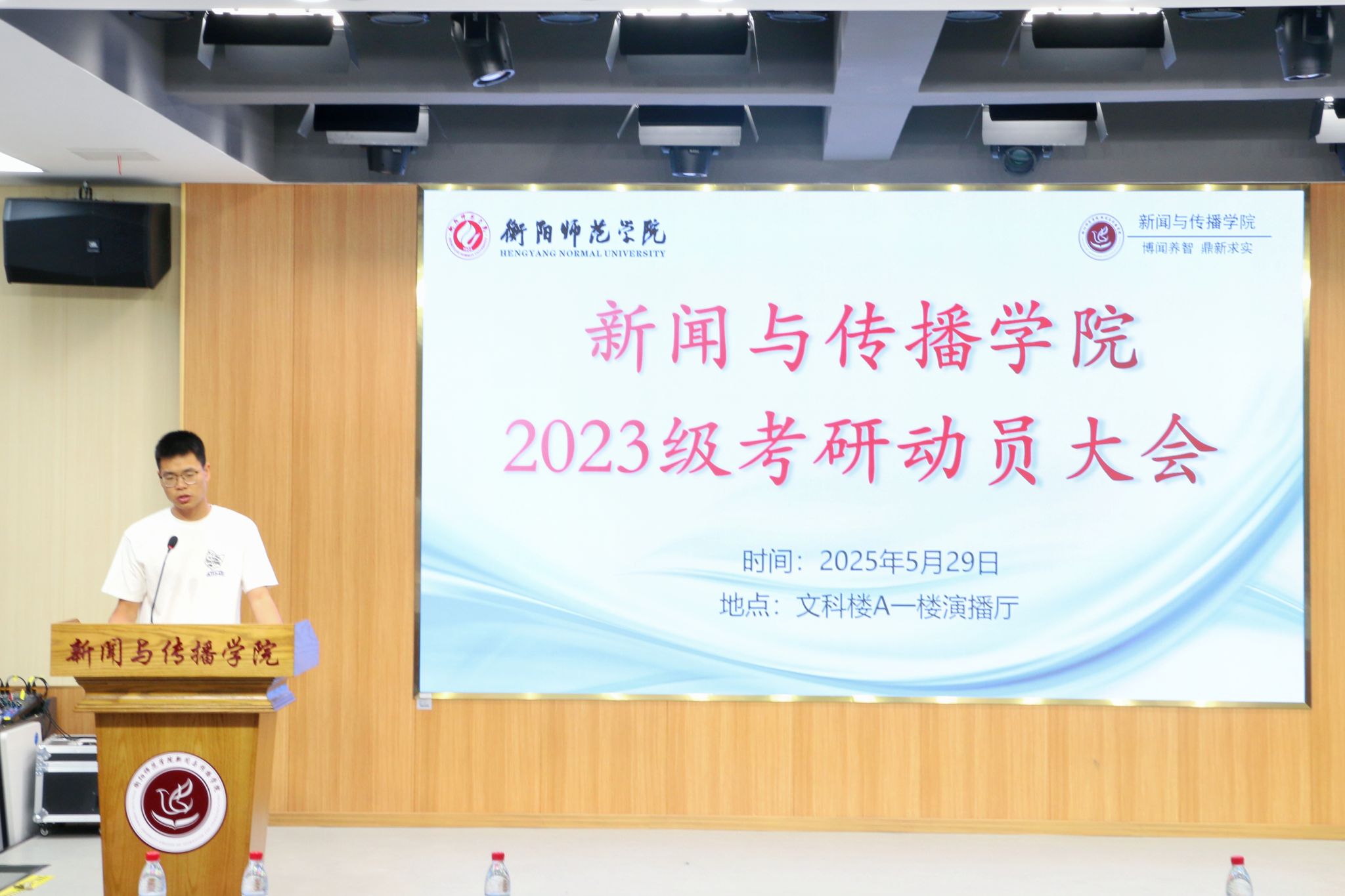 2025年5月29日,tyc122ccvip在文智楼107演播厅召开了2023级考研动员大会。tyc122ccvip辅导员刘国杰老师、良师考研机构刘建老师、2021级新闻学二班朱彦姿以及2023级全体同学参与此次会议。