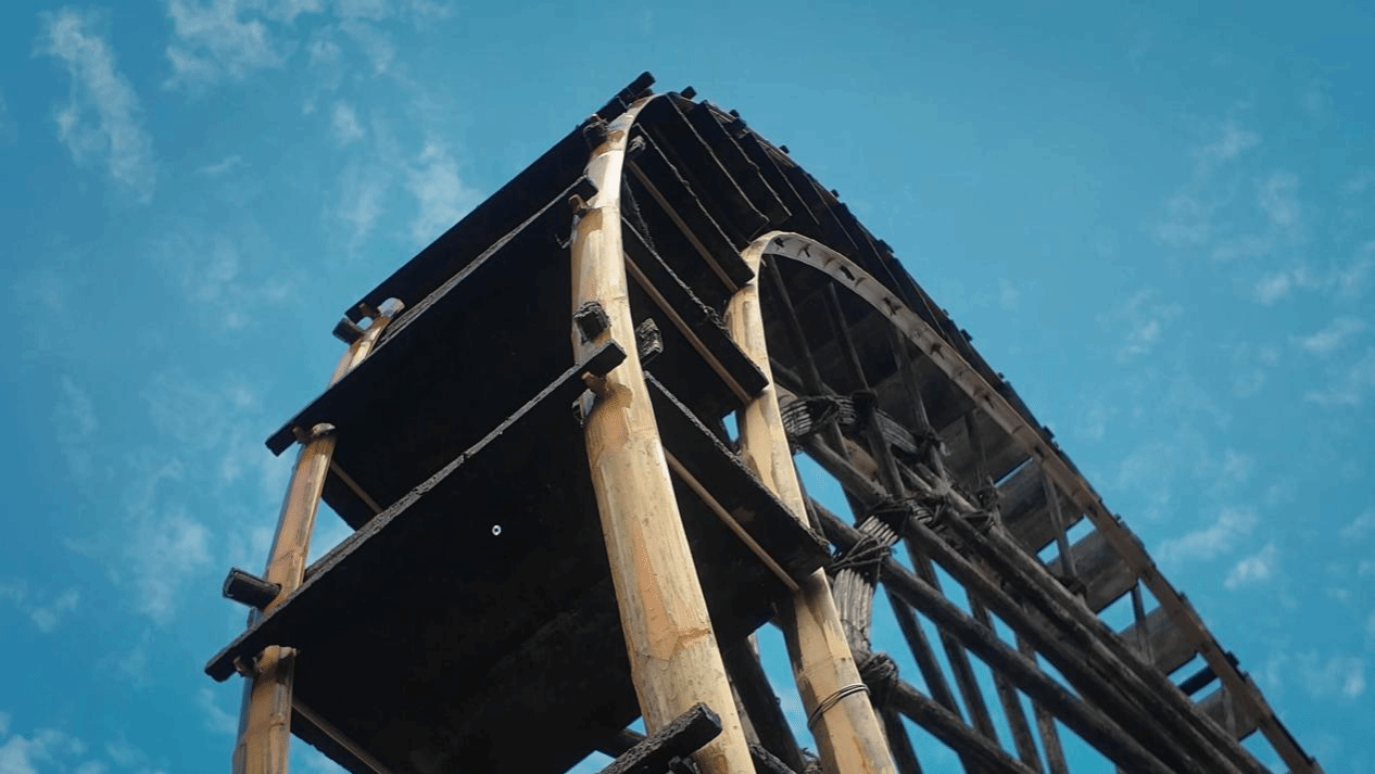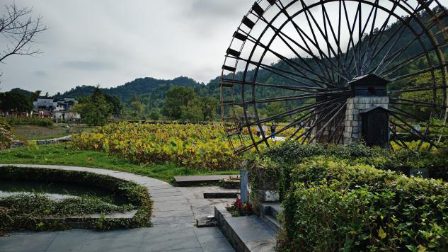 金黄稻田与木质栈道将我们引入这片土地,饱满的稻穗与如镜的湖水相映,展现了农耕文明与自然风光的和谐画卷。古朴的木质水车在荷塘边静静伫立,潺潺流水诉说着先民利用自然、营造生存环境的生态智慧。大片农田与白墙黛瓦的村落全景勾勒出“天人合一的聚落格局”,斑驳的墙体是岁月的诗篇,远处的青山如屏,守护着这片宁静。