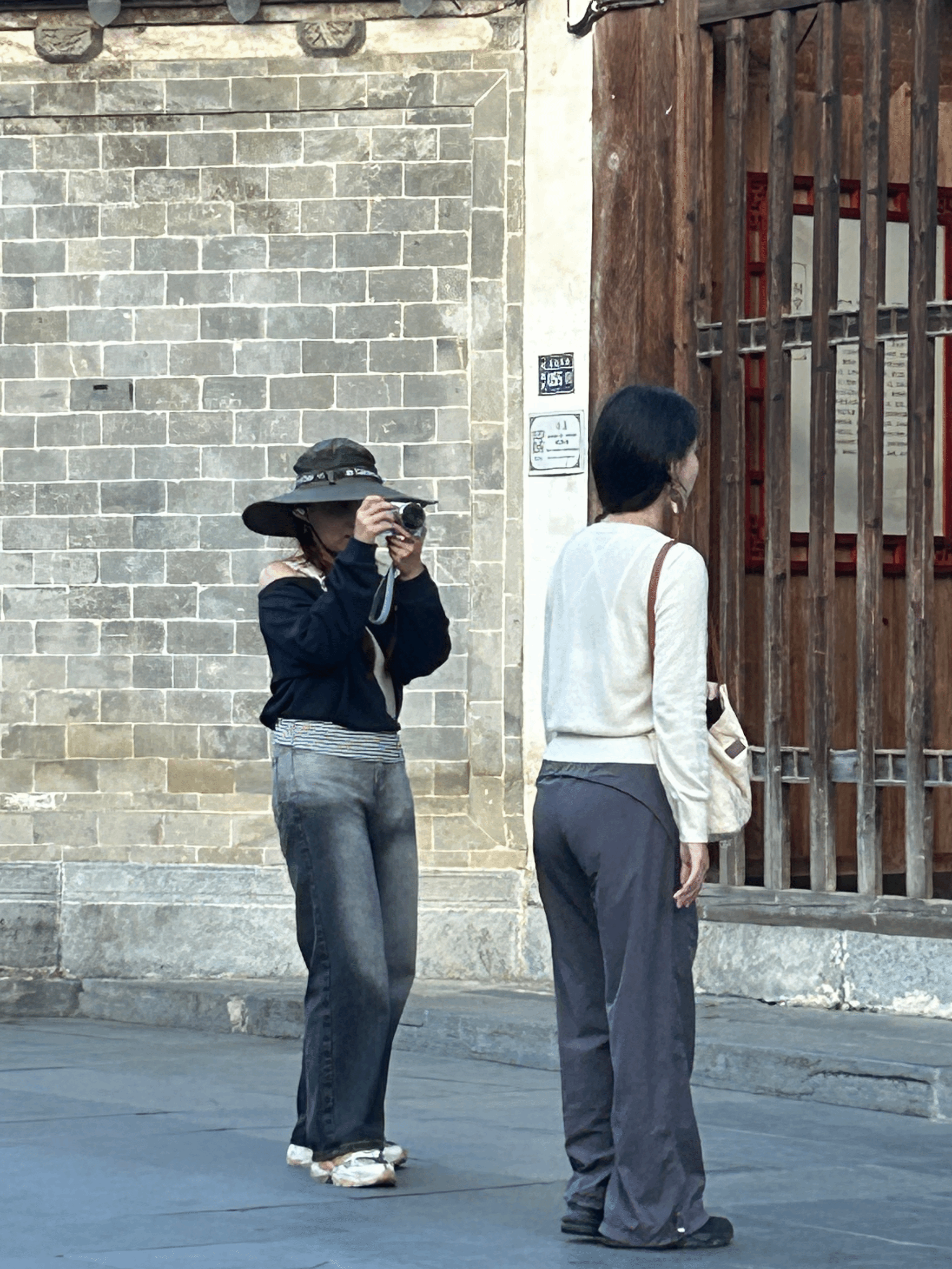 在安徽西递的见习第四日,我们的镜头不仅记录了传统梳艺的匠心,更定格了古村街巷里的人文与景致。漫步西递古村,青灰色的砖墙承载着岁月的痕迹。小组的摄影成员戴着宽檐帽,专注地举着相机,将同伴与古建的画面收入镜头,每一次按下快门,都是对西递建筑美学的一次捕捉。