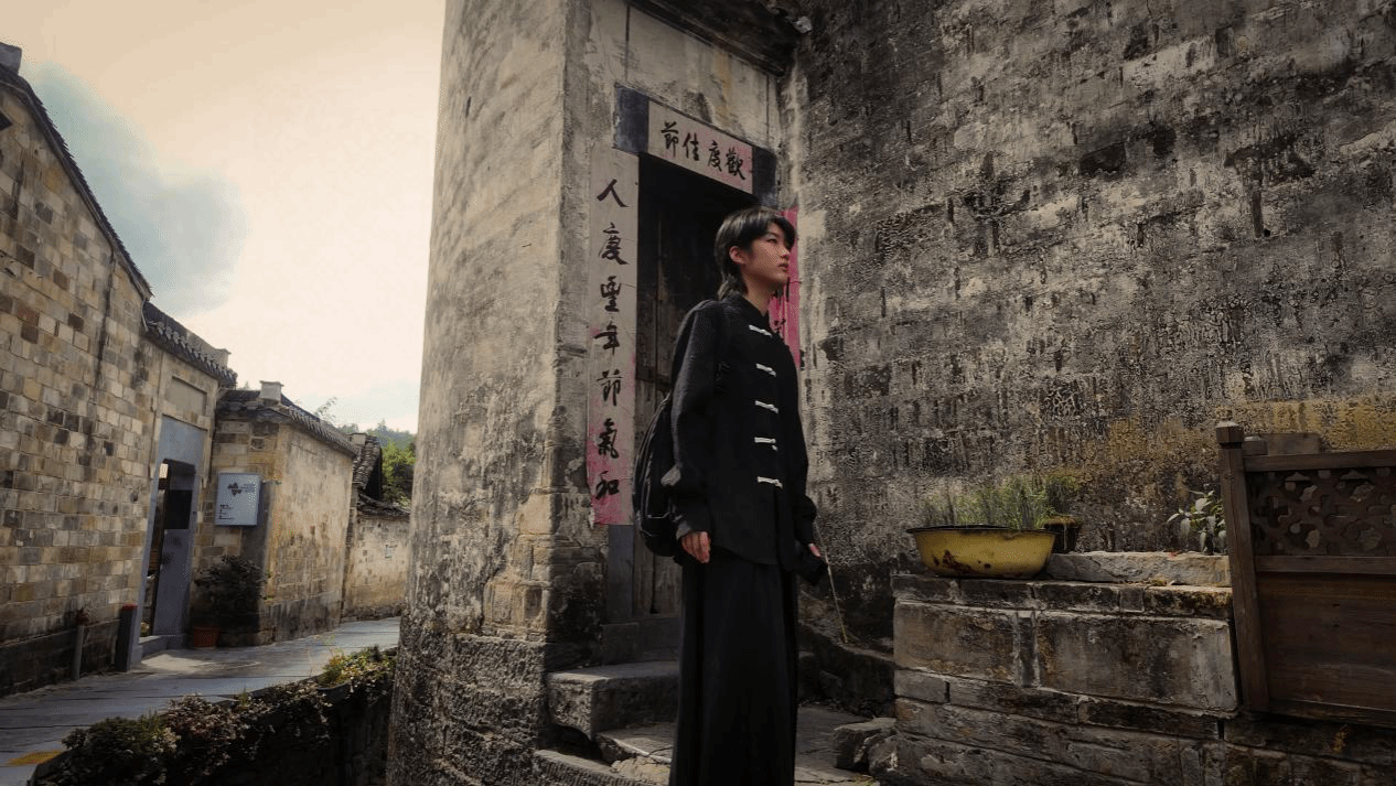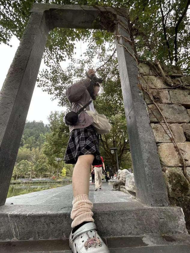 而在古村的另一处,石制门框与藤蔓交织成天然的取景框,小组成员以独特的视角,让自己的身影与背后的山水、古建相融,用镜头探索着西递景观的多样表达。