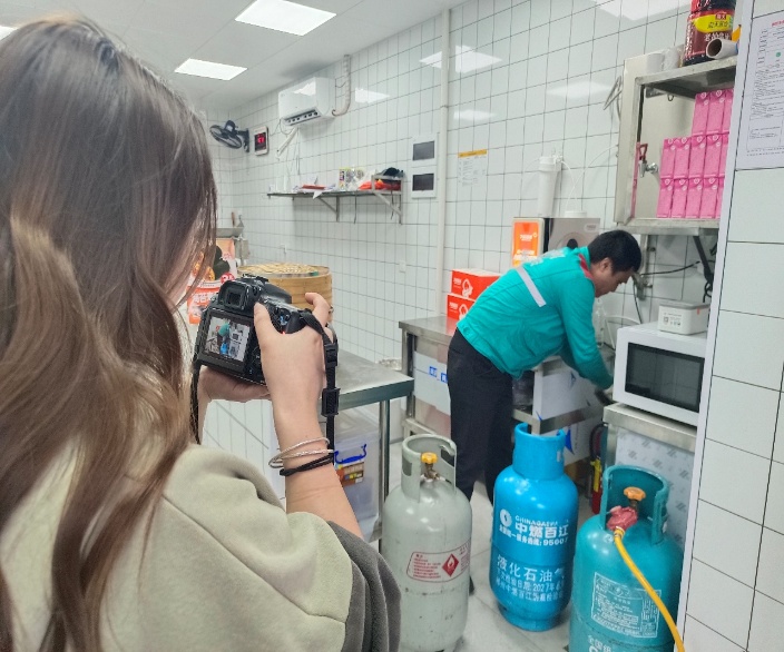 10月28日,一组去中燃百气拍摄燃气办工作人员运输空燃气罐的镜头画面,跟谭元喜师傅去几家餐饮店运送燃气罐,拍摄谭元喜和店家的交流画面。谭元喜每日的送气工作,从搬运燃气罐、细致做安全检查,到耐心普及安全知识,这套流程他早已烂熟于心,而每一个熟练步骤的背后,都是对每户人家燃气安全的坚实保障。