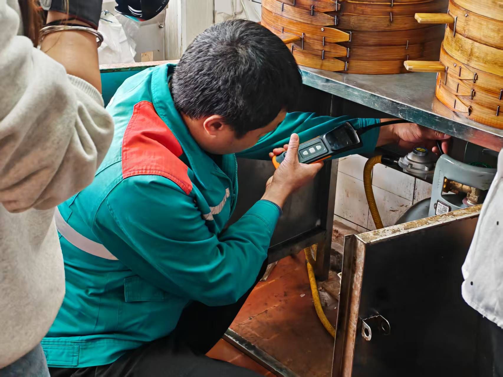下午三点半,我们跟拍谭元喜师傅送气的整个流程。到达送气地点后,谭元喜带上手套检查报警器、使用漏气仪检测有无漏气情况、搬运空燃气桶、安放新燃气桶……一步一步按流程走下来,确保每一户的燃气安全。