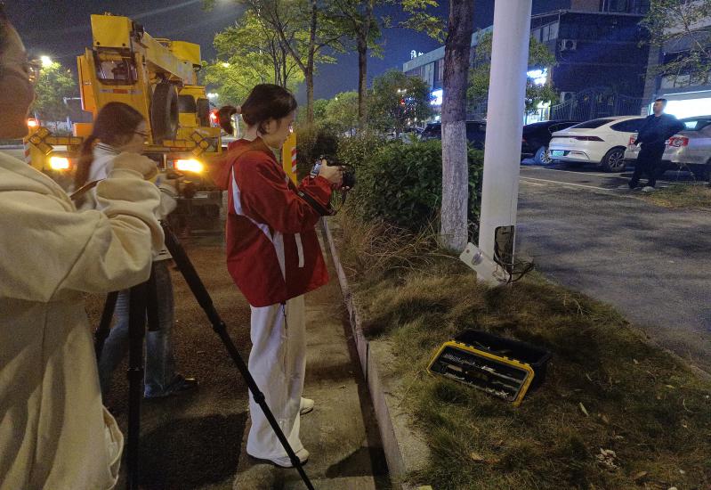 抵达现场后,跟随谢民平沿预定路线行进,记录检修工作流程:从通过专业仪器检测路灯线路通断、查看灯杆基础稳固性,到登梯检查灯头内部零件损耗、更换故障光源或镇流器,同步拍摄关键操作镜头。