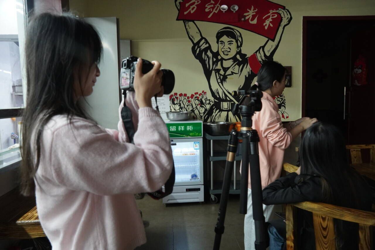 小组成员正在拍摄食堂的内部环境