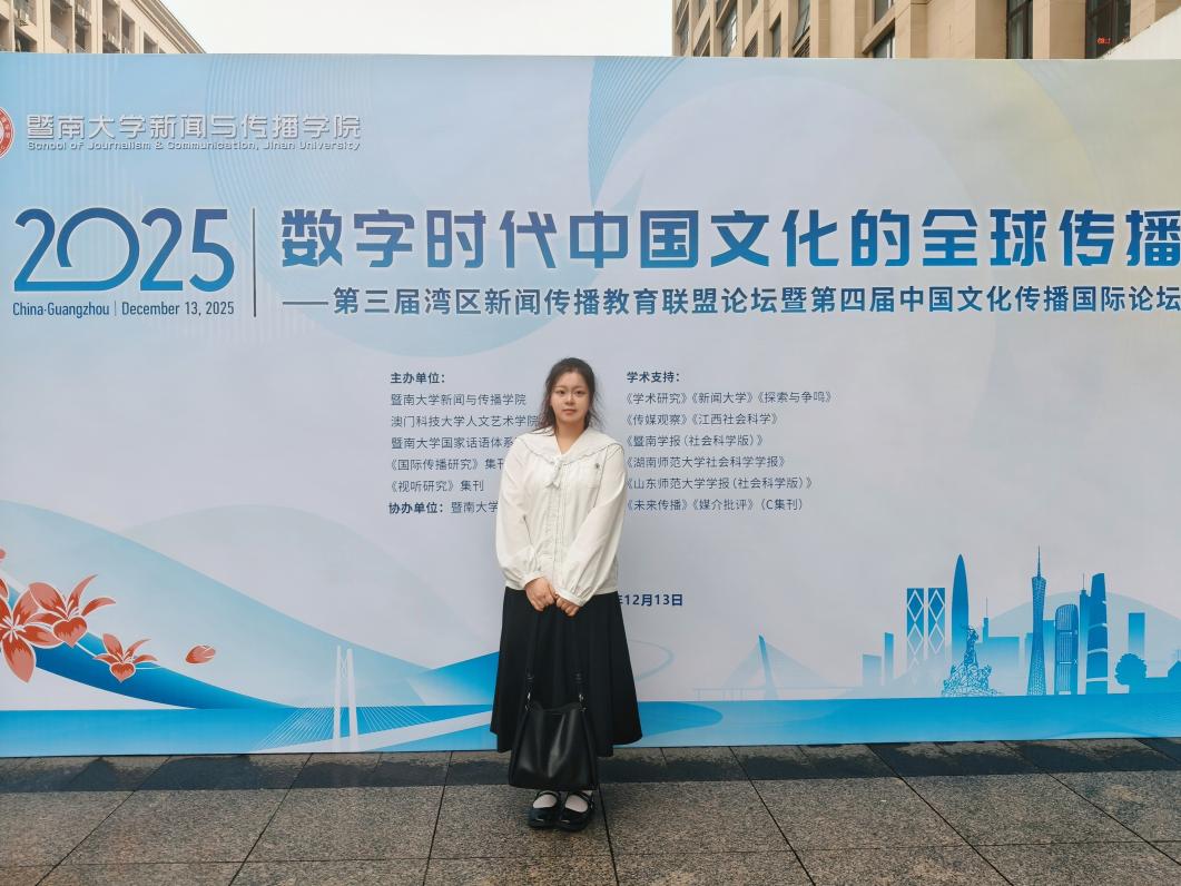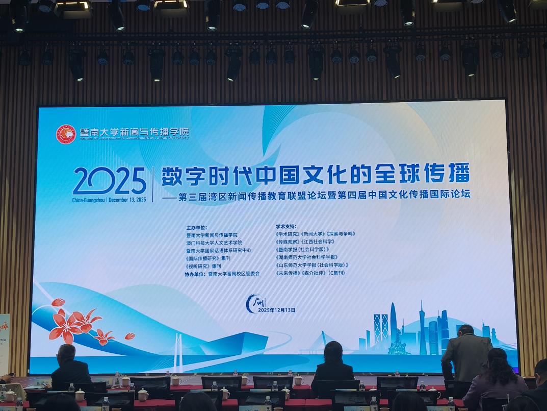 2025年12月13日,由暨南大学tyc122ccvip、暨南大学国家话语体系研究中心、《视听传播》集刊、《国际传播研究》集刊主办的“第三届湾区新闻传播教育联盟论坛暨第四届中国文化传播国际论坛”在广州成功举行。本届论坛主题为“数字时代中国文化的全球传播”,来自全国多所高校及研究机构的专家学者、青年学子与会。公司邓庄教授及其指导的硕士研究生林文轩、徐佳妮受邀参加此次论坛,并在会上进行学术成果展示与交流。