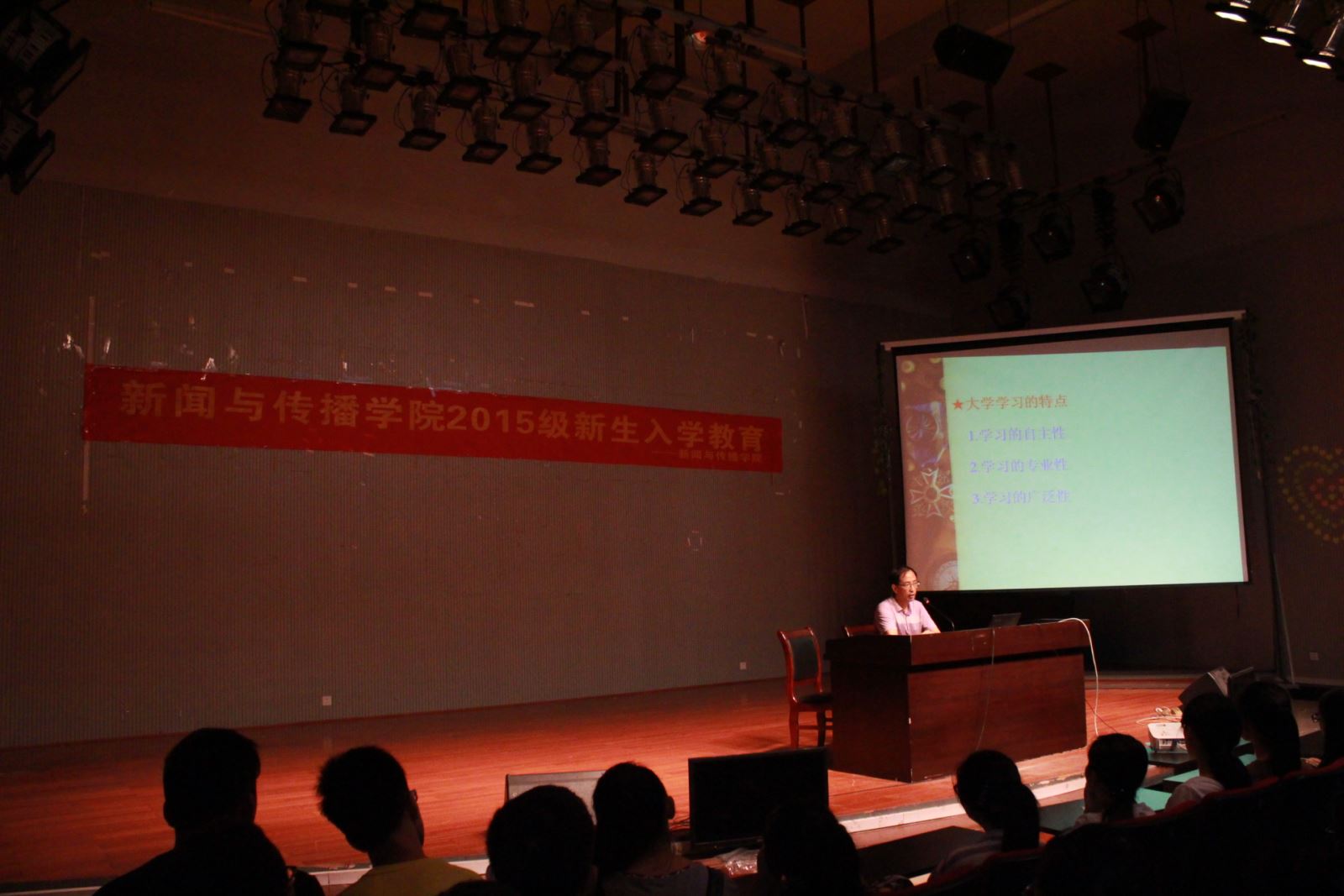 第二场座谈会的现场不时传来阵阵欢笑声。邓玉久书记展示的充满网络特色的PPT和朴实又个性化的语言赢得了同学们的热烈反响。邓书记首先跟大家分享了自己的大学记忆,希望大家能珍惜大学的四年时光。接着,邓书记在思想道德及个人修养等方面结合自身的经历告诫新生们要在大学四年里好好充实自己,学会做人,怀揣着一颗感恩的心去对自己的父母和身边的老师同学,将来争取成为一名栋梁之才。