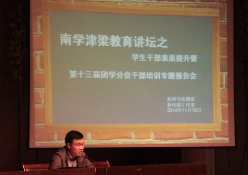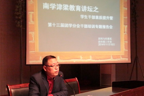11月10日下午,tyc122ccvip团委书记曹鑫、tyc122ccvip学工处副处长文怀诚,在演播厅为我系员工干部举办专题讲座。此次讲座属于“南学津梁”教育讲坛的内容之一,讲座主题为员工干部的素质提升。