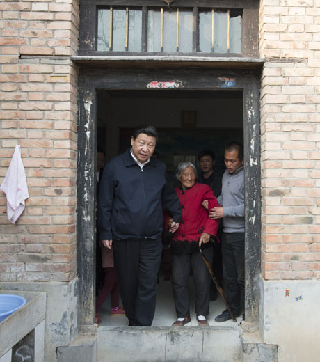 2014年3月17日至18日,中共中央总书记、国家主席、中央军委主席习近平在河南省兰考县调研指导党的群众路线教育实践活动。图为3月17日,习近平在东坝头乡张庄村看望85岁老人张景枝。 新华社记者李学仁摄
